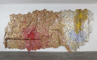El Anatsui, Gravity and Grace, 2010, Aluminium liquor bottle caps and copper wire, Photo courtesy, Susan Vogel