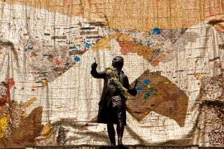 El Anatsui, TSIATSIA - Searching For Connection, 2013, on the facade of the Royal Academy of Arts. Photo, by Jonathan Greet