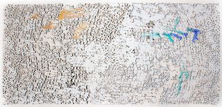 Untitled Gold With Blue, 2013, Monotype with stenciling and hand painted enamel on aluminium sheet, 41 x 76 in, Photo courtesy, Zane Bennett Contemporary Art