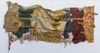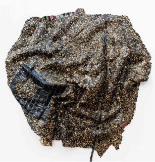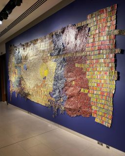 Material Earth showcases the works of three Ghanaian pioneers of visual arts, El Anatsui, Yaw Owusu and Isshaq Ismail. These artists have sewn and are sewing their names into the fabric of contemporary African regardless of what direction current trends in the industry are taking. The title of the exhibition, Material Earth, refers to the use of upcycled material in the creative processes of these artists, the use of everyday materials transformed into works of complex beauty.